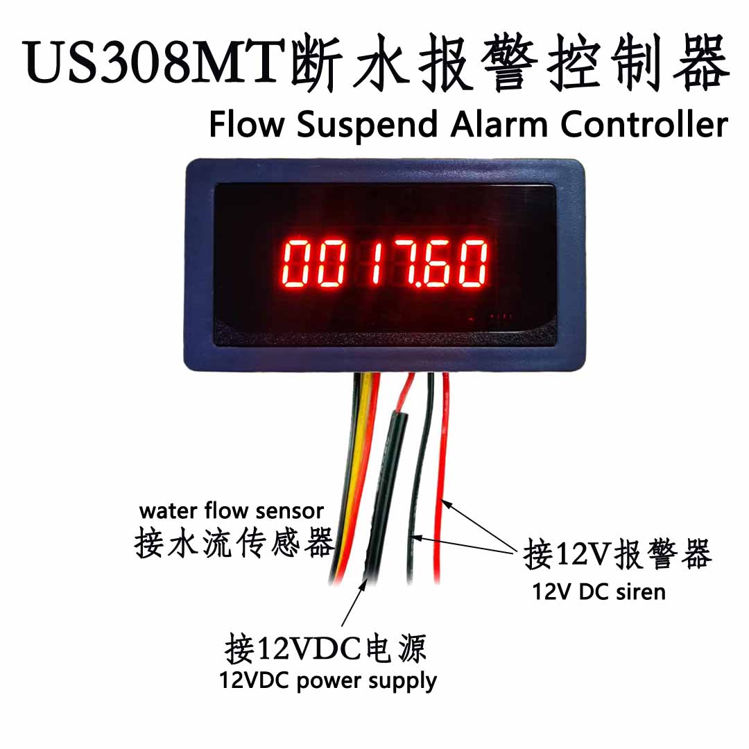 流速计流量报警器US308MT为山东信准电子科技有限公司为水流量传感器有针对性研制开发的简易型即时流量测试仪,可代替示波器等脉冲测试仪,输出数字型频率信号(不输出方波),显示即时的脉冲值/流速,带一路报警输出,可设置流速上、下限报警;总量报警。可外接110分贝大音量声光报警器。配合我司的水流量传感器或者齿轮油流量传感器,可以实现断水、断油报警,保护水泵,系统等。此套控制器广泛应用于循环水断水报警,中频炉断水报警,中回水断流报警等系统。